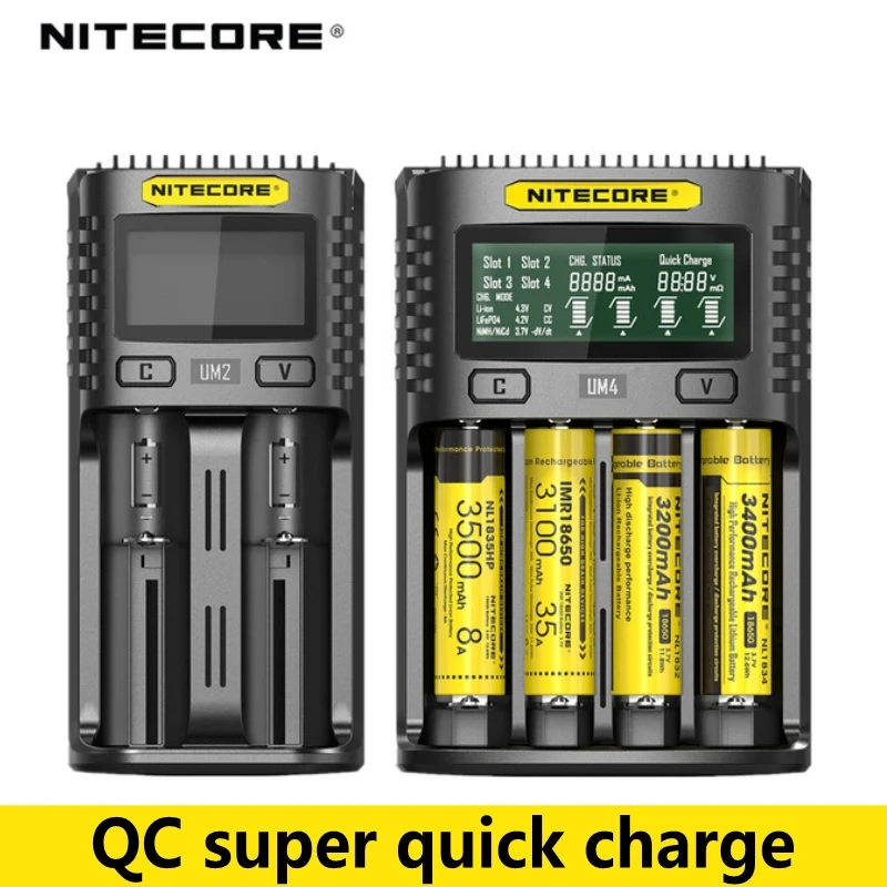 100%Original NITECOR UM4 UM2 LCD USB QC Smart Battery Charger for Li-ion IMR INR ICR LiFePO4 18650 14500 26650 AA 3.7V 1.2V 1.5V