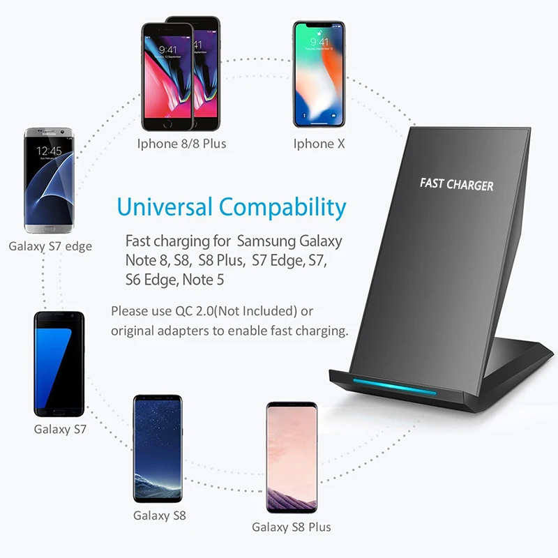 CinkeyPro QI Wireless Charger Quick Charge 2.0 Fast Charging for iPhone 8 10 X Samsung S6 S7 S8 2-Coils Stand 5V/2A & 9V/1.67A